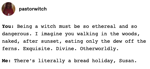 Most Pagan gatherings (circles, moots, or festivals) end with “Cakes and Ale” (or juice and cookies). Because we honor the Earth’s bounty, the food is usually incredible. We take “potluck” very seriously. Our pots are extremely lucky. You haven’t lived until you’ve shared a homemade rosemary loaf and local honey with a group of people who just spent an hour chanting under the stars. I remember this meme from long ago:
